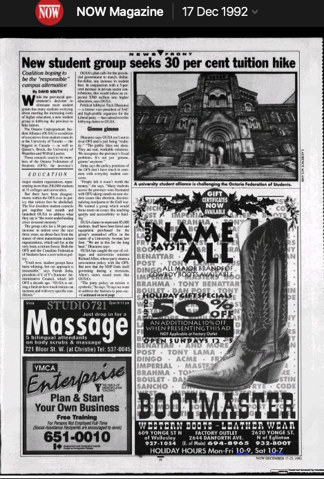 “People felt it wasn’t worth the money,” she says. “Many students across the province were frustrated with OFS taking stands on non-student issues like abortion, decriminalizing marijuana or the Gulf war. We wanted a group which would focus more on issues like teaching quality and accessibility to funding.”