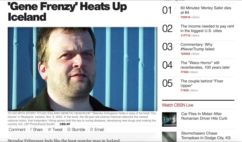 From CBS News: ‘Gene Frenzy’ Heats Up Iceland by Jill Lawless, Associated Press, December 2, 2002.
