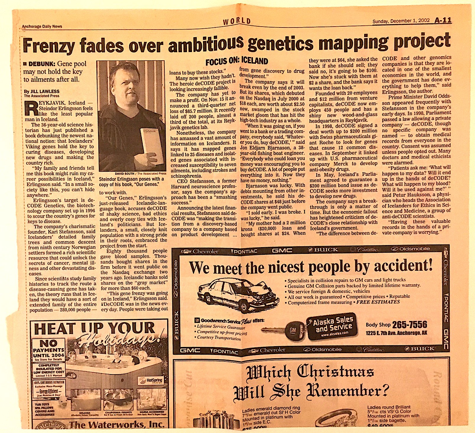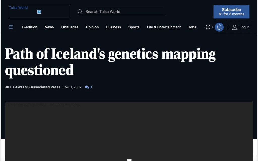 From Tulsa World: Path of Iceland’s genetics mapping questioned by Jill Lawless, December 1, 2002.