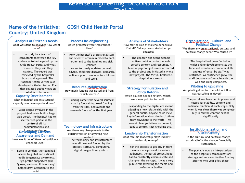In the health workshop, we shared two projects for the reverse engineering component: the GOSH Child Health Portal and the magazine Southern Innovator (link to PowerPoint). Using the Reverse Engineering tool (see images below), each project was broken down as to how it worked and also what was its contribution to South-South Cooperation.