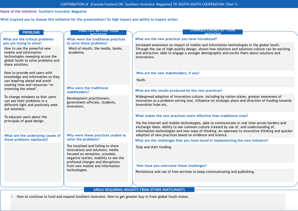 The Southern Innovator brand (incubated and developed by the UNOSSC) is a good example of what can be achieved with a more cohesive and strategic approach. Southern Innovator, first launched in 2011 by the UNOSSC, was able to leverage its limited resources to reach a large global audience via the web and social media. The brand became established with innovators and five issues were published (from 2011 to 2015). An Action Plan for scaling-up the Southern Innovator brand was also developed with the UNOSSC in 2015 (but awaits funding).