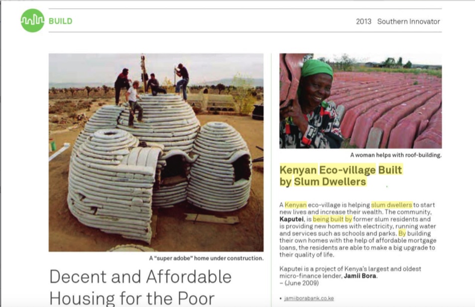 Jamii Bora came up with the idea of building an entire community from scratch, and doing it in way that was affordable, ecological and sustainable, while building the wealth of the residents. Since 2007, the project has provided homes for 50 families; the target is to have homes for 2,000.