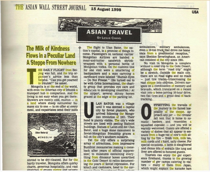 The Milk of Kindness Flows in a Peculiar Land A Steppe From Nowhere by Leslie Chang (The Asian Wall Street Journal, 15 August 1998)