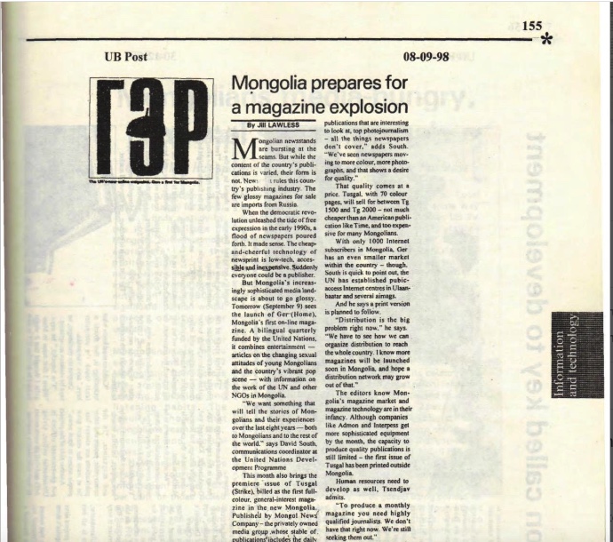 Mongolia prepares for a magazine explosion by Jill Lawless (UB Post, 08-09-98)
