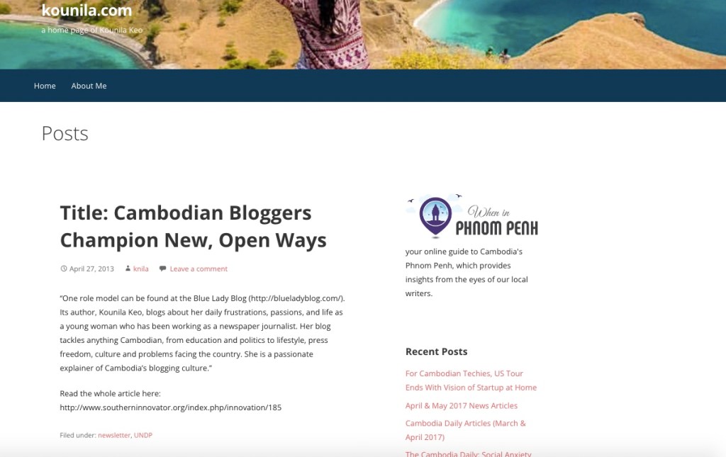 One role model can be found at the Blue Lady Blog (http://blueladyblog.com/). Its author, Kounila Keo, blogs about her daily frustrations, passions, and life as a young woman who has been working as a newspaper journalist. Her blog tackles anything Cambodian, from education and politics to lifestyle, press freedom, culture and problems facing the country. She is a passionate explainer of Cambodia’s blogging culture.