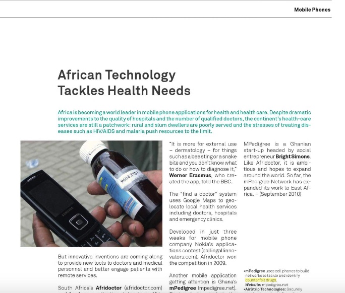 MPedigree is a Ghanian start-up headed by social entrepreneur Bright Simons (http://www.worldpress.org/freelancers/index.cfm/hurl/page=freelancerDetails/id=7). Like Afridoctor, it is ambitious and hopes to expand around the world. So far, the mPedigree Network has expanded its work to East Africa.