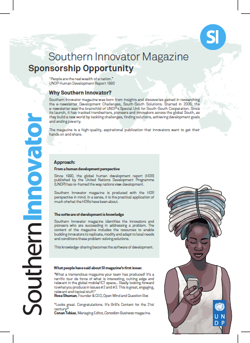 Development Challenges, South-South Solutions was launched as an e-newsletter in 2006 by UNDP’s South-South Cooperation Unit (now the United Nations Office for South-South Cooperation) based in New York, USA. It led on profiling the rise of the global South as an economic powerhouse and was one of the first regular publications to champion the global South’s innovators, entrepreneurs, and pioneers. It tracked the key trends that are now so profoundly reshaping how development is seen and done. This includes the rapid take-up of mobile phones and information technology in the global South (as profiled in the first issue of magazine Southern Innovator), the move to becoming a majority urban world, a growing global innovator culture, and the plethora of solutions being developed in the global South to tackle its problems and improve living conditions and boost human development. The success of the e-newsletter led to the launch of the magazine Southern Innovator.
