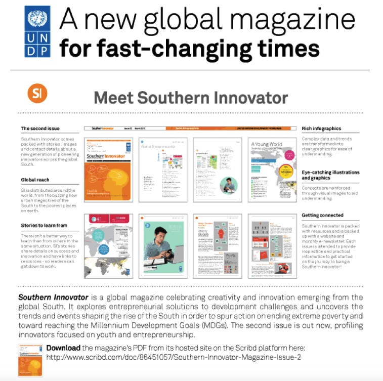 Development Challenges, South-South Solutions was launched as an e-newsletter in 2006 by UNDP’s South-South Cooperation Unit (now the United Nations Office for South-South Cooperation) based in New York, USA. It led on profiling the rise of the global South as an economic powerhouse and was one of the first regular publications to champion the global South’s innovators, entrepreneurs, and pioneers. It tracked the key trends that are now so profoundly reshaping how development is seen and done. This includes the rapid take-up of mobile phones and information technology in the global South (as profiled in the first issue of magazine Southern Innovator), the move to becoming a majority urban world, a growing global innovator culture, and the plethora of solutions being developed in the global South to tackle its problems and improve living conditions and boost human development. The success of the e-newsletter led to the launch of the magazine Southern Innovator.