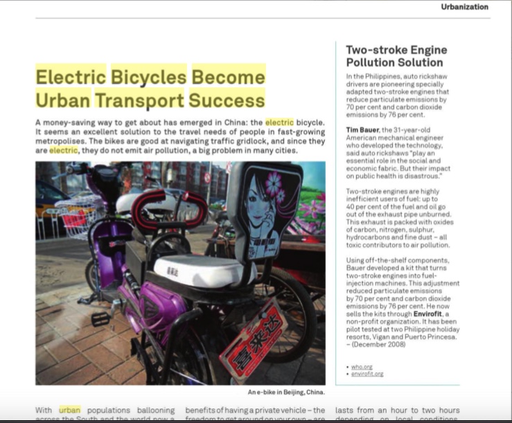 The success of e-bikes in China is striking: It is estimated there are four times more electric bikes than cars in the country, 120 million in all. According to the Electric Bikes website (www.electricbikee.com), the number of electric bicycles produced each year has grown from 200,000 eight years ago to 22 million in 2008. It is estimated to be a US $11 billion a year business: a true Southern success story that is going around the world.
