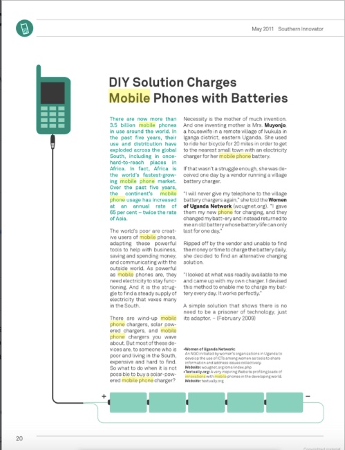 As powerful as mobile phones are, they need electricity to keep working. The struggle to find a steady supply of electricity vexes many in the South, so finding cheap or free ways to recharge the phones represents a huge market opportunity.