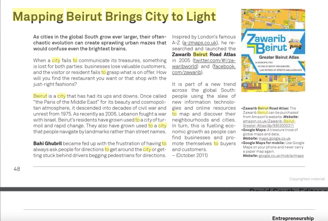 Inspired by London’s famous A-Z (http://www.a-zmaps.co.uk), he researched and launched the Zawarib Beirut Road Atlas in 2005 (http://twitter.com/#!/zawaribworld) and (http://www.facebook.com/zawarib).