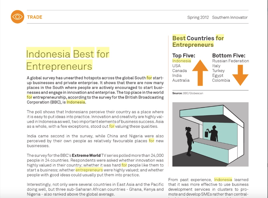 A global survey has unearthed hotspots across the global South for start-up businesses and private enterprise. It shows there are now many places in the South where people are actively encouraged to start businesses and engage in innovation and enterprise. The top place in the world for entrepreneurship, according to the survey for the British Broadcasting Corporation (BBC), is Indonesia.