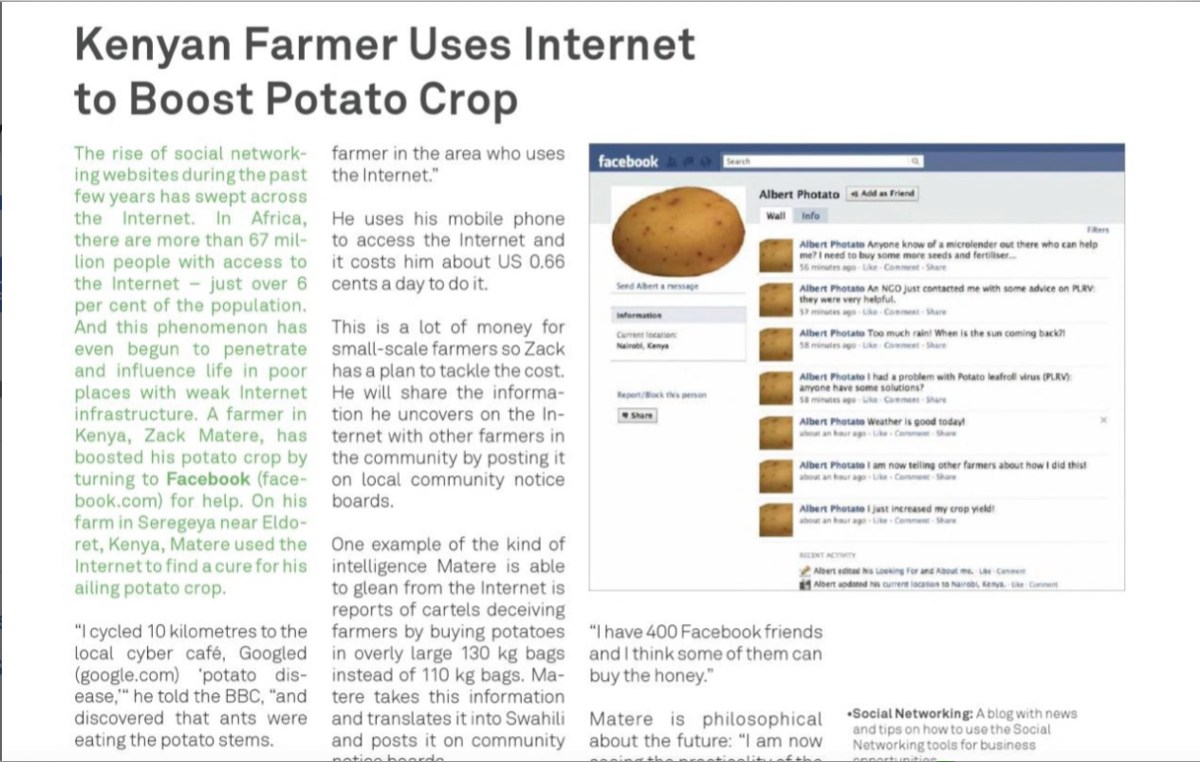 The rise of social networking websites (http://en.wikipedia.org/wiki/List_of_social_networking_websites) during the past few years has swept across the internet. The popular Facebook (www.facebook.com) site alone has over 350 million users worldwide. In Africa, there are more than 67 million people with access to the internet – just over 6 percent of the population (http://www.internetworldstats.com/stats1.htm). And this phenomenon has even begun to penetrate and influence life in poor places with weak internet infrastructure. A farmer in Kenya, Zack Matere, has boosted his potato crop by turning to Facebook for help.