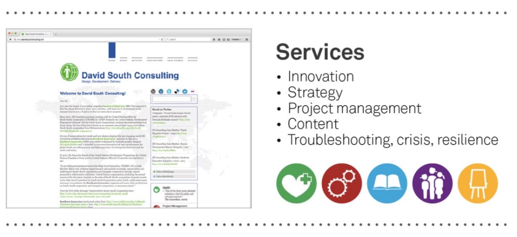 Unique in this area, David South International can bring first-hand experience leading innovative and transformative projects, combined with a wealth of knowledge on innovation gleaned first-hand from those who are doing it around the world. From being called the ‘Godfather of the Mongolian Web’ to a “role model” at the United Nations and the UK’s NHS, DSI has a knack for being where it is just getting exciting. What is the result? A sparky mind that can offer rich insights combined with practical actions to get results.