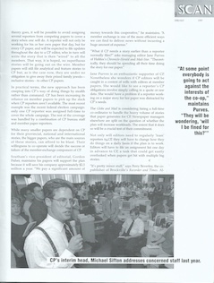 CP general manager Jim Poling, who vacates he job in June, believes this problem will be solved by the restructuring, not exacerbated by it. “The volume of copy has already dropped significantly,” he says. “We are hoping for a wider spectrum of deadlines. Hopefully you are going to get your copy spread out over a longer period, instead of over the course of a couple of hours. You might not need a massive shift of people to a certain time.”