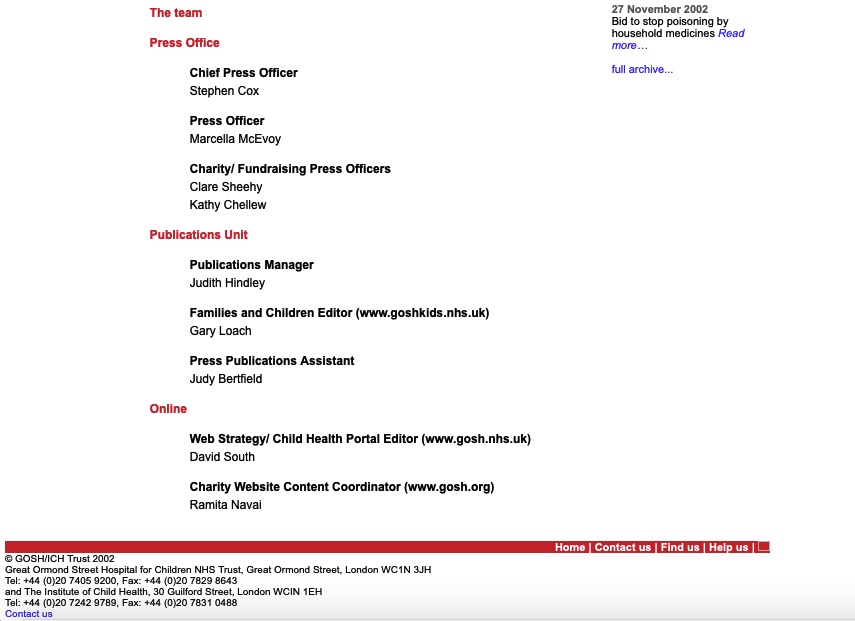 A great way to track the historical development of a web project is to use the Wayback Machine’s internet archive here. By typing in the web address (for example, www.gosh.nhs.uk, and www.gosh.org), you can see a chronological history of the website by month.