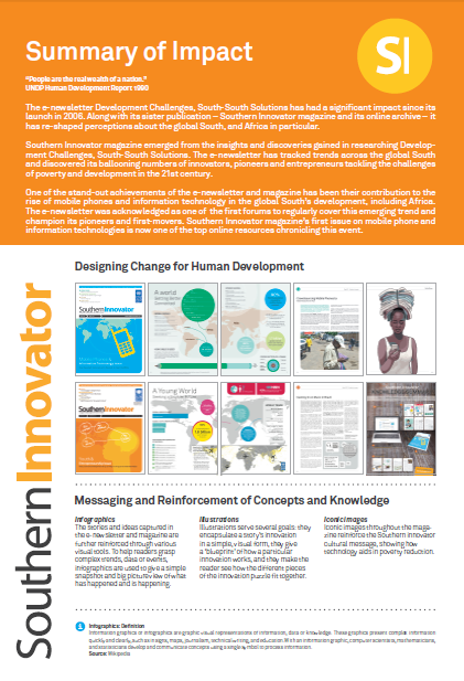 Development Challenges, South-South Solutions was launched as an e-newsletter in 2006 by UNDP’s South-South Cooperation Unit (now the United Nations Office for South-South Cooperation) based in New York, USA. It led on profiling the rise of the global South as an economic powerhouse and was one of the first regular publications to champion the global South’s innovators, entrepreneurs, and pioneers. It tracked the key trends that are now so profoundly reshaping how development is seen and done. This includes the rapid take-up of mobile phones and information technology in the global South (as profiled in the first issue of magazine Southern Innovator), the move to becoming a majority urban world, a growing global innovator culture, and the plethora of solutions being developed in the global South to tackle its problems and improve living conditions and boost human development. The success of the e-newsletter led to the launch of the magazine Southern Innovator.