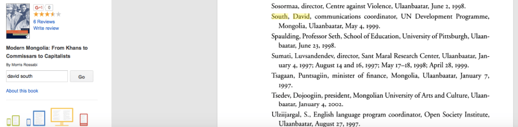 “Mongolia is not an easy country to live in and David [South] showed a keen ability to adapt in difficult circumstances. He was sensitive to the local habits and cultures and was highly respected by his Mongolian colleagues. … David’s journalism background served him well in his position as Director of the Communications Unit. … A major accomplishment … was the establishment of the UNDP web site. He had the artistic flare, solid writing talent and organizational skills that made this a success. … we greatly appreciated the talents and contributions of David South to the work of UNDP in Mongolia.” Douglas Gardner, UN Resident Coordinator and UNDP Resident Representative Mongolia