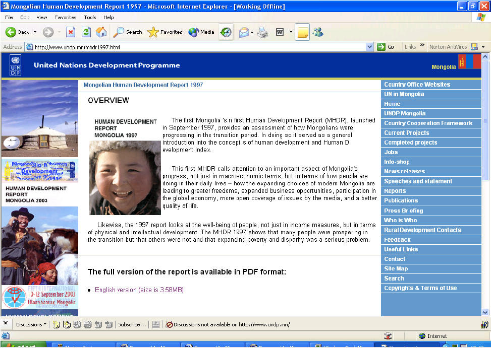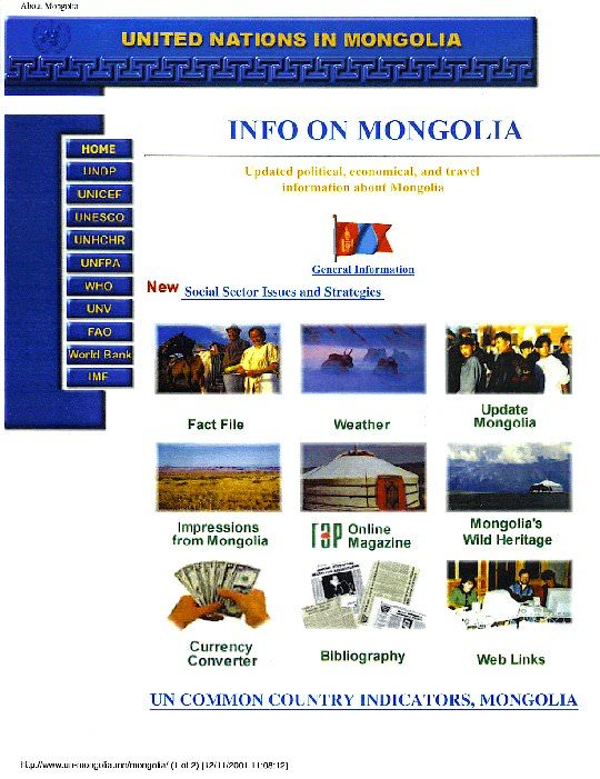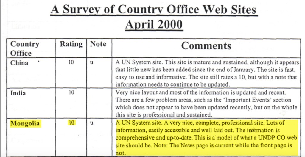 The UN/UNDP Mongolia homepage quickly became the top resource for development news on Mongolia in the late 1990s.“A UN System site. A very nice, complete, professional site. Lots of information, easily accessible and well laid out. The information is comprehensive and up-to-date. This is a model of what a UNDP CO web site should be.”