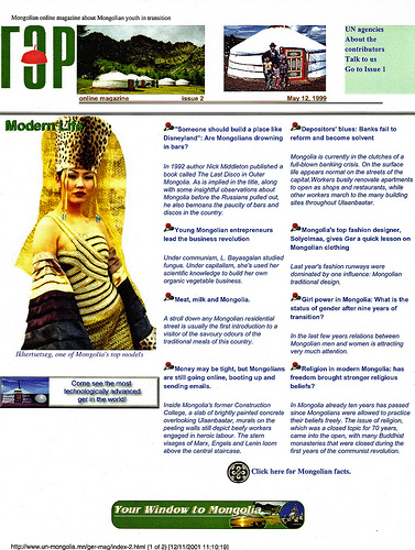 Issue 1 of the magazine investigated what life was like for youth during the transition years (post-1989). Stories tackled the struggle to find work in the free market, the booming pop music scene and how it is leading the way in business entrepreneurship, reproductive health, the basics on Mongolian culture, and vox pop views from Mongolian youth.Issue 2 of the magazine investigated modern life in Mongolia during transition. The team of journalists were hitting their stride by this issue. Stories probed the proliferation of bars and the problem of alcoholism, corrupt banking practices and the loss of savings, how the young were the country’s leading entrepreneurs, Mongolia’s meat and milk diet, “girl power” and the strong role played by women, the burgeoning new media, the rise and rise of Buddhism, and Mongolia’s dynamic fashion designers (this article inspired foreign fashion designers to embrace the Mongolian ‘look’ in the next season’s designs).