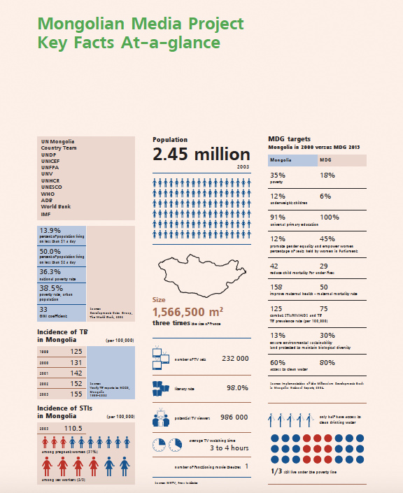 Human Development Infographics: Infographics have proven a useful visual aid for communicating human development concepts. This example was created for a UNDP Mongolia report during missions undertaken in 2005.