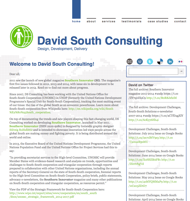 Five years prior to the MDGs deadline in 2015, the David South Consulting website went live (2010). Featuring a new branding and design, it signaled a new design phase more comfortable with developments in social media and online and mobile content sharing. Designed by Solveig Rolfsdottir, one of Iceland’s top graphic designers and illustrators, the website’s design was intentially made compatible with the new global magazine, Southern Innovator (also designed by Solveig Rolfsdottir).The online story archive for Southern Innovator was launched by the United Nations Office for South-South Cooperation (UNOSSC) in 2011. Organized by theme, the stories were cited in blogs, books and reports around the world.