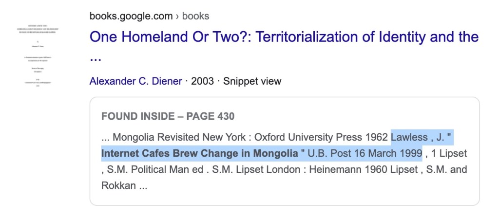 “Internet Cafes Brew Change in Mongolia”, UB Post 16 March 1999 by Jill Lawless, cited in One Homeland or Two?: Territorialization of Identity and the Migration Decision of the Mongolian-Kazakh Diaspora by Alexander C. Diener, 2003.