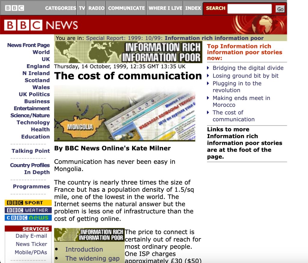 “Information Rich Information Poor: The cost of communication”, BBC News Online, Thursday, 14 October 1999.