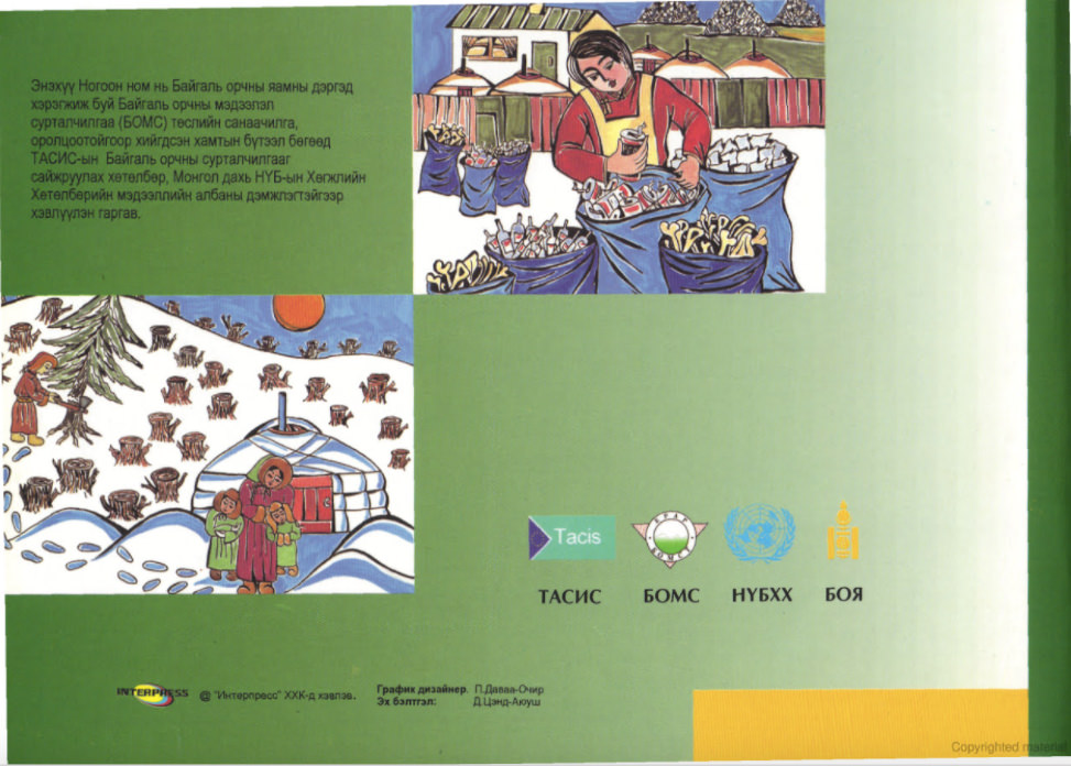 Environmental Public Awareness Handbook: Case Studies and Lessons Learned in Mongolia by Robert Ferguson (ISBN 9992950137): The Environmental Public Awareness Handbook was published in 1999 and features the case studies and lessons learned by UNDP’s Mongolian Environmental Public Awareness Programme (EPAP). The handbook draws on the close to 100 small environmental projects the Programme oversaw during a two-year period. These projects stretched across Mongolia, and operated in a time of great upheaval and social, economic and environmental distress. The handbook is intended for training purposes and the practice of public participation in environmental protection.