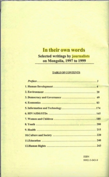 In Their Own Words: Selected Writings by Journalists on Mongolia, 1997-1999, Editor-in-Chief: David South, Research Editor: Julie Schneiderman (ISBN 99929-5-043-9): In their own words compiles by theme the vast number of stories and features by journalists on Mongolia’s transition experience from 1997 to 1999. A rich and unusual resource for a developing country, this book offers the reader a one-stop snapshot of how a country handles the wrenching social, political, cultural, economic and environmental challenges of changing from one political and economic system to another.