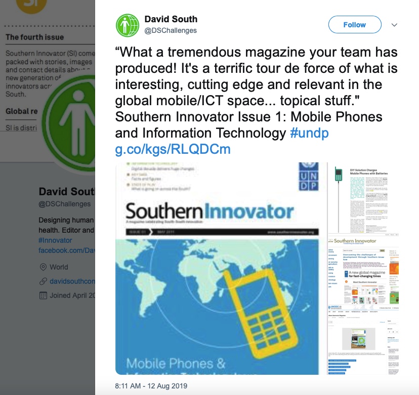 Development Challenges, South-South Solutions was launched as an e-newsletter in 2006 by UNDP’s South-South Cooperation Unit (now the United Nations Office for South-South Cooperation) based in New York, USA. It led on profiling the rise of the global South as an economic powerhouse and was one of the first regular publications to champion the global South’s innovators, entrepreneurs, and pioneers. It tracked the key trends that are now so profoundly reshaping how development is seen and done. This includes the rapid take-up of mobile phones and information technology in the global South (as profiled in the first issue of magazine Southern Innovator), the move to becoming a majority urban world, a growing global innovator culture, and the plethora of solutions being developed in the global South to tackle its problems and improve living conditions and boost human development. The success of the e-newsletter led to the launch of the magazine Southern Innovator.