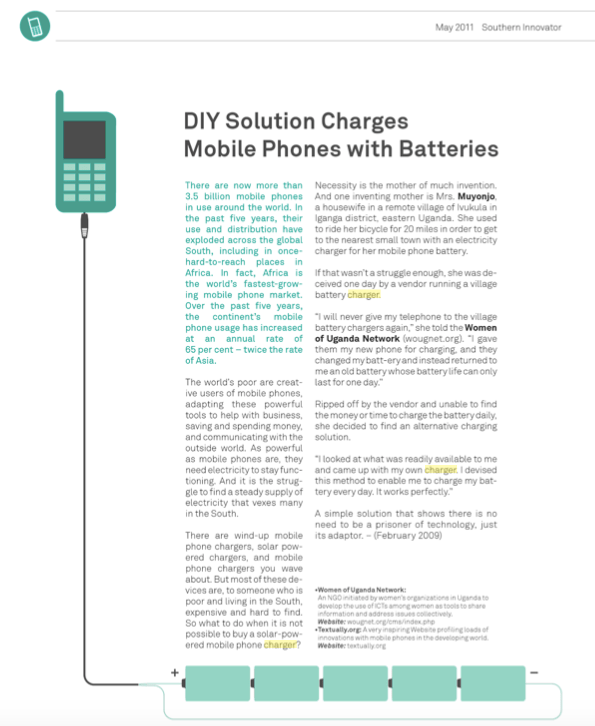 Development Challenges, South-South Solutions was launched as an e-newsletter in 2006 by UNDP’s South-South Cooperation Unit (now the United Nations Office for South-South Cooperation) based in New York, USA. It led on profiling the rise of the global South as an economic powerhouse and was one of the first regular publications to champion the global South’s innovators, entrepreneurs, and pioneers. It tracked the key trends that are now so profoundly reshaping how development is seen and done. This includes the rapid take-up of mobile phones and information technology in the global South (as profiled in the first issue of magazine Southern Innovator), the move to becoming a majority urban world, a growing global innovator culture, and the plethora of solutions being developed in the global South to tackle its problems and improve living conditions and boost human development. The success of the e-newsletter led to the launch of the magazine Southern Innovator.