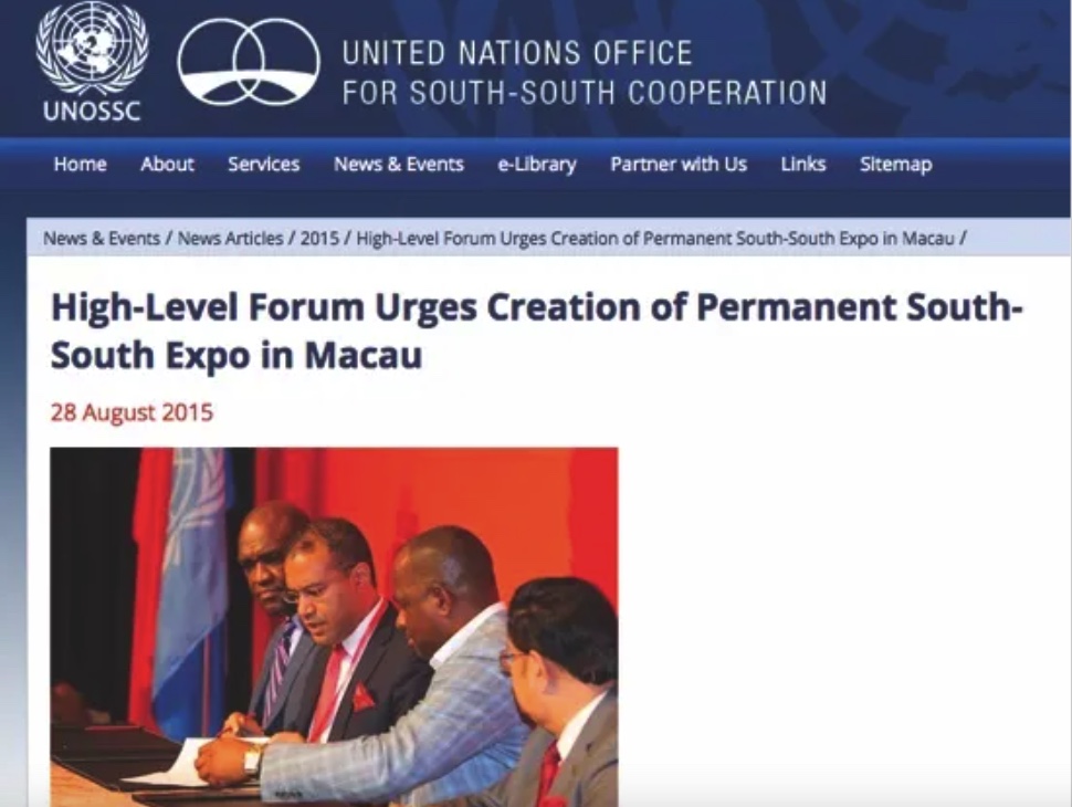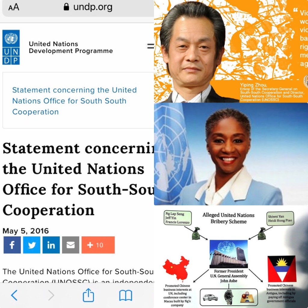 “Corruption at any level of government undermines the rule of law and cannot be tolerated. But corruption is especially corrosive when it occurs at an international body like the United Nations. By paying bribes to two U.N. ambassadors to advance his interest in obtaining formal support for the Macau conference center project, Ng Lap Seng tried to manipulate the functions of the United Nations. The sentence handed down today demonstrates that those who engage in corruption will pay a heavy price and serves as a reminder that no one stands above the law.”, Acting Assistant General John P. Cronan, May 2018In March 2015 UNOSSC Director Yiping Zhou signed a cooperation agreement with the Sun Kian Ip Group of Macau to “set up a multi-partner trust fund to promote the cause of South-South Cooperation” (https://usanewsonline.com/2015/03/07/south-south-cooperation-and-chinese-sun-kian-ip-group-signs-cooperation-agreement/). In April 2015 UNOSSC Deputy Director Inyang Ebong-Harstrup met with the Chairman of the Sun Kian Ip Group, Ng Lap Seng, in Macau (https://www.wsj.com/articles/u-n-team-had-cleared-group-at-center-of-bribery-case-1444432560).