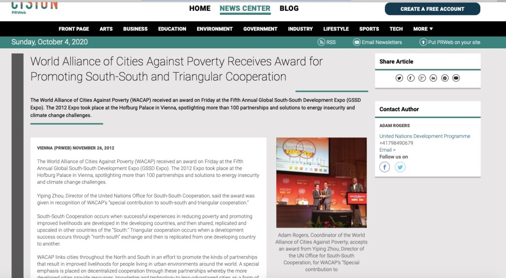 “Adam Rogers, Coordinator of the World Alliance of Cities Against Poverty, accepts an award from Yiping Zhou, Director of the UN Office for South-South Cooperation, for WACAP’s ‘Special contribution'”. (Vienna, November 26, 2012)