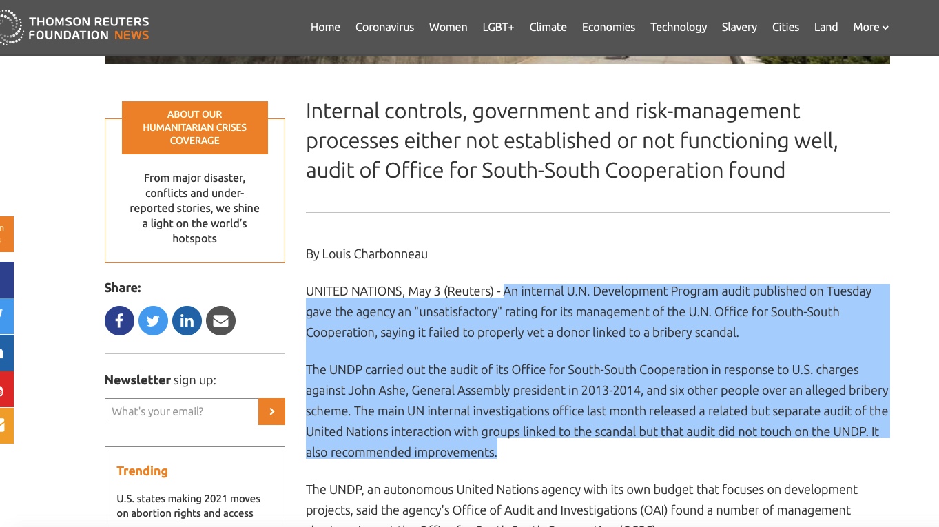 Note: This blog post provides a summary of the unfolding corruption case that targeted the United Nations from 2010 and was revealed in 2015 by US authorities. It is offered as a resource for those interested in the role played by corruption in international development and international institutions, or who are interested in case law and the application of the Foreign Corrupt Practices Act. If anything, the case stands as a brazen act of criminality and corruption, and, with South-South News still based out of the United Nations and still functioning as a news service, maybe proof the UN has a long way to go to walk the talk on fighting corruption.