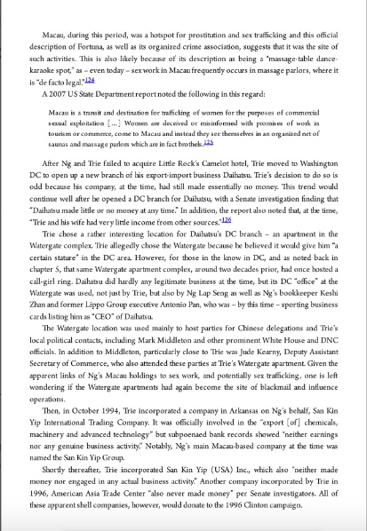 “One of his associates, Ng Lap Seng of the Macau-based San Kin Yip company, has since been identified as the financier of Charlie Trie, who in turn has been indicted in US courts for his involvement in the donor scandal. Both Ng and Wo are allegedly close to local Triads as well as mainland Chinese commercial interests.”