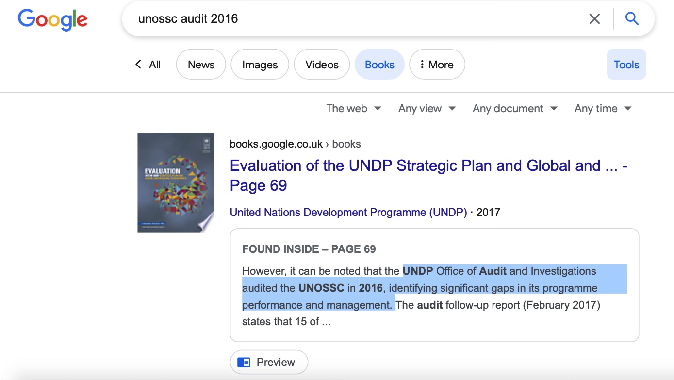 UNOSSC is hosted by UNDP and, as is the case with similar entities, is expected to follow UNDP rules and regulations, including those pertaining to financial and HR management. UNOSSC is likewise subject to UNDP’s oversight and due diligence instruments.
