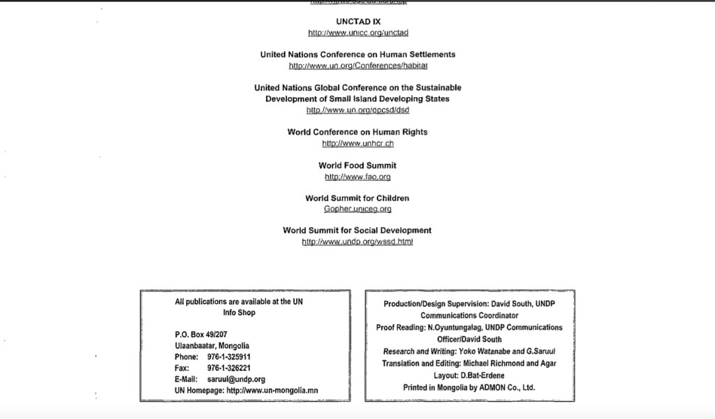 The report we prepared, Mongolia’s Follow-Up to the UN Global Conferences, helped inform what became the Millennium Development Goals (MDGs) (launched in 2000). The e-newsletter Development Challenges, South-South Solutions (published from 2006 to 2014) and the magazine Southern Innovator (published from 2011 to 2015) both informed the debates that led to the Sustainable Development Goals (SDGs), launched in 2015. The report was used as a resource by the UN-funded OneWorld Youth Conference in 1999. As UN Secretary-General Kofi Annan said in a press release on 11 June 1999, “‘Never Should Young- People Have To Be Protected from Government’, Kofi Annan Adds in Message to Final UN OneWorld Youth Conference, in Mongolia.” The report was cited in Women in Mongolia: Mapping Progress under Transition (United Nations Development Fund for Women, 304 East 45th Street, New York, NY 10017, USA).
