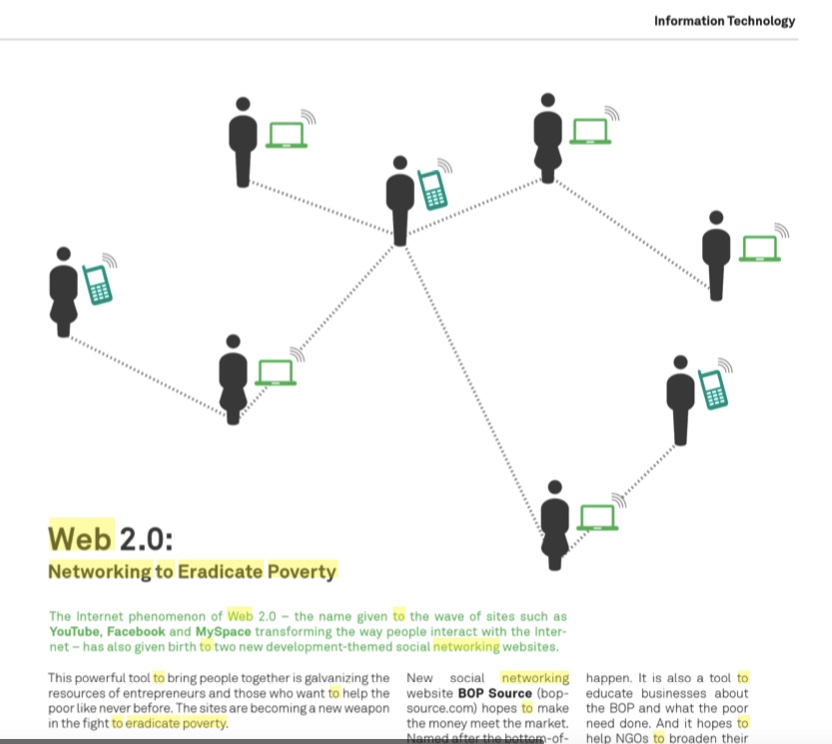 New social networking website BOP Source hopes to make the money meet the market. Started by Jenara Nerenberg, BOP Source wants to put social networking tools into the hands of the world’s poor. It is a place to post business ideas and collaborate with others to make them happen. It is also a tool to educate businesses about the BOP and what the poor need done. And it hopes to help NGOs broaden their relationships with their constituencies and companies.