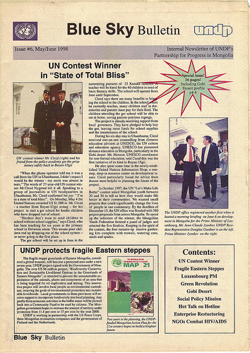 The Blue Sky Bulletin newsletter was launched in 1997 initially as a simple, photocopied handout. It quickly founds its purpose and its audience, becoming a key way to communicate what was happening in the country and a crucial resource for the global development community, scholars, the media and anyone trying to figure out what was happening in a crazy and chaotic time. Blue Sky Bulletin was distributed via email and by post and proved to be a popular and oft-cited resource on the country. The quality of its production also paralleled Mongolia’s growing capacity to publish to international standards, as desktop publishing software became available and printers switched to modern print technologies. Blue Sky Bulletin evolved from a rough, newsprint black and white publication to becoming a glossy, full-colour, bilingual newsletter distributed around Mongolia and the world.