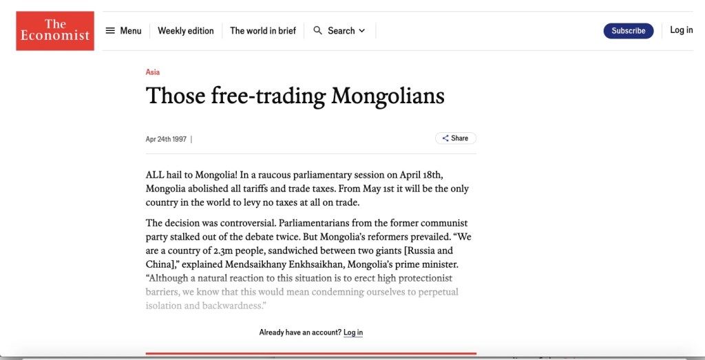 Richard Pomfret said in 1994 “In 1991 Mongolia suffered one of the biggest peacetime economic collapses ever (Mongolia’s Economic Reforms: Background, Content and Prospects, Richard Pomfret, University of Adelaide, 1994).”