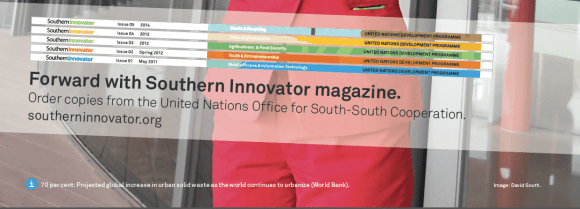 Development Challenges, South-South Solutions was launched as an e-newsletter in 2006 by UNDP’s South-South Cooperation Unit (now the United Nations Office for South-South Cooperation) based in New York, USA. It led on profiling the rise of the global South as an economic powerhouse and was one of the first regular publications to champion the global South’s innovators, entrepreneurs, and pioneers. It tracked the key trends that are now so profoundly reshaping how development is seen and done. This includes the rapid take-up of mobile phones and information technology in the global South (as profiled in the first issue of magazine Southern Innovator), the move to becoming a majority urban world, a growing global innovator culture, and the plethora of solutions being developed in the global South to tackle its problems and improve living conditions and boost human development. The success of the e-newsletter led to the launch of the magazine Southern Innovator.