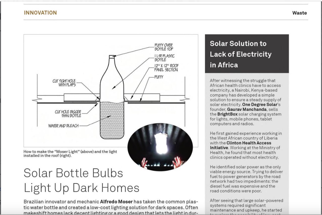 A social enterprise is seeking to capture the power of the sun to bring light and economic opportunity to women in Africa. Using a direct-marketing distribution system, it sells solar lamps and lanterns to some of Africa’s remotest communities. Solar Sister (www.solarsister.org), launched in Uganda in 2010, is hoping to do for power generation what mobile phones have done for communication in Africa: make a technological leap to a model of grassroots power generation, rather than waiting for large-scale power schemes to eventually reach the poor and rural.