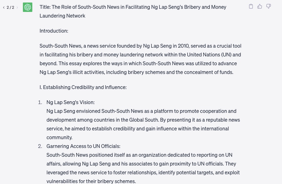 South-South News, a news service founded by Ng Lap Seng in 2010, served as a crucial tool in facilitating his bribery and money laundering network within the United Nations (UN) and beyond. This essay explores the ways in which South-South News was utilized to advance Ng Lap Seng’s illicit activities, including bribery schemes and the concealment of funds.