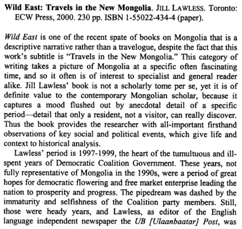 De Canadese Jill Lawless werkte als redacteur in Mongolië bij de enige Engelstalige en onafhankelijke krant The UB Post. Zij schreef ook diverse artikelen over Mongolië voor internationale dagbladen. Momenteel woont en werkt ze als verslaggeefster in Londen.