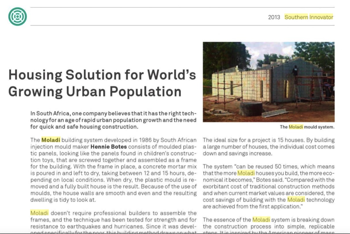 Moladi benefits from South Africa’s Black Economic Empowerment programme (http://www.southafrica.info/business/trends/empowerment/bee.htm) and is certified for its quality with the South African Bureau of Standards (SABS) (https://www.sabs.co.za/). Moladi contractors and developers are working in 15 countries and the technique is distributed in a further seven countries.