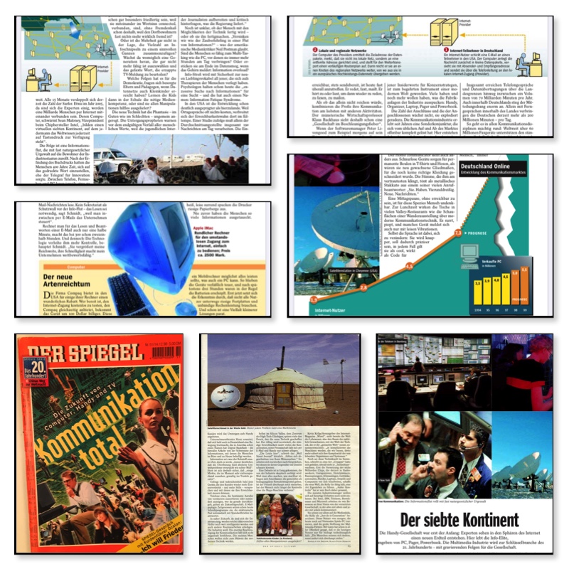 “Die Handy-Gesellschaft war erst der Anfang: Experten sehen in den Sphären des Internet einen neuen Erdteil entstehen. Hier lebt die Info-Elite, umgeben von PC, Pager, Powerbook. Die Multimedia-Industrie wird zur Schlüsselbranche des 21. Jahrhunderts – mit gravierenden Folgen für die Gesellschaft.”