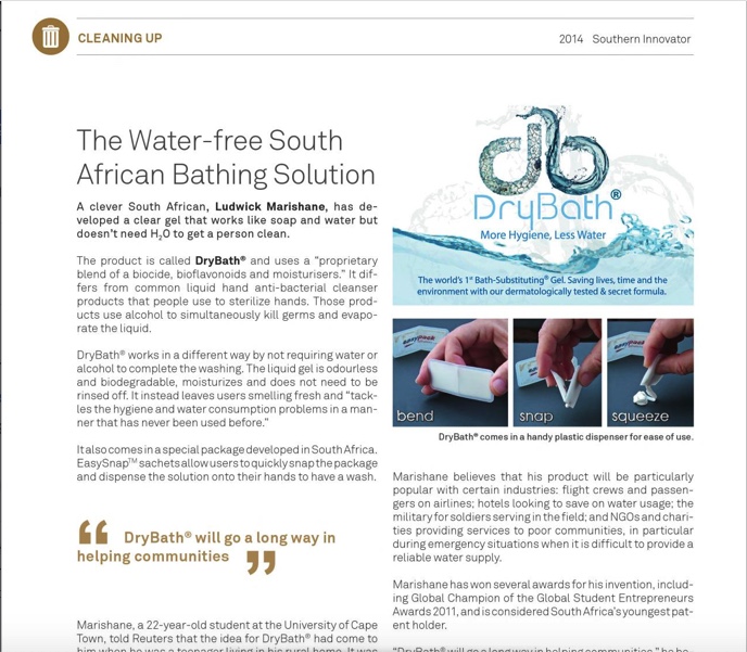 Marishane, a 22-year-old student at the University of Cape Town, told Reuters that the idea for DryBath came to him when he was a teenager living in his rural home. It was wintertime and his friend didn’t want to bother washing because there was no hot water available.