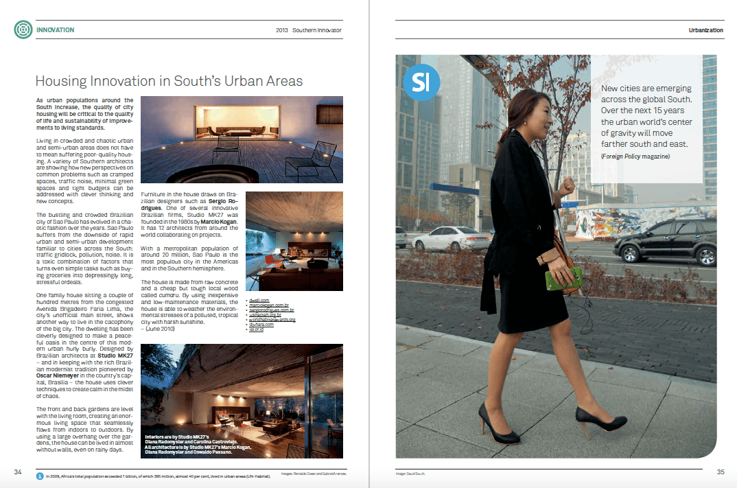 Development Challenges, South-South Solutions was launched as an e-newsletter in 2006 by UNDP’s South-South Cooperation Unit (now the United Nations Office for South-South Cooperation) based in New York, USA. It led on profiling the rise of the global South as an economic powerhouse and was one of the first regular publications to champion the global South’s innovators, entrepreneurs, and pioneers. It tracked the key trends that are now so profoundly reshaping how development is seen and done. This includes the rapid take-up of mobile phones and information technology in the global South (as profiled in the first issue of magazine Southern Innovator), the move to becoming a majority urban world, a growing global innovator culture, and the plethora of solutions being developed in the global South to tackle its problems and improve living conditions and boost human development. The success of the e-newsletter led to the launch of the magazine Southern Innovator.