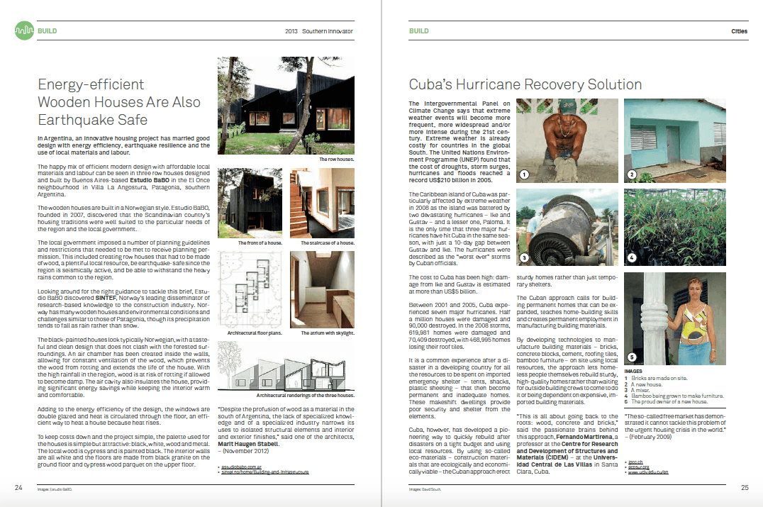 Chilean Eco-Buildings Pioneering Construction Methods Development Challenges: Across the global South, the search is on for new ways to build without extracting a high price from local environments.More and more people are recognizing the advantages of energy-saving methods like prefabrication. Prefab building techniques involve assembling a structure from pre-assembled parts or modules made in a factory, or transporting a completed, factory-made structure to a site (http://en.wikipedia.org/wiki/Prefabricated_building).